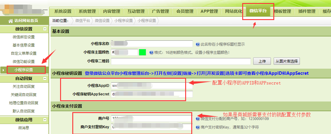 登錄友點網(wǎng)站管理后臺【微信平臺】-【小程序設(shè)置】輸入微信小程序的基本參數(shù)配置