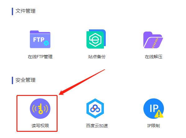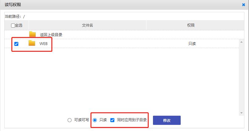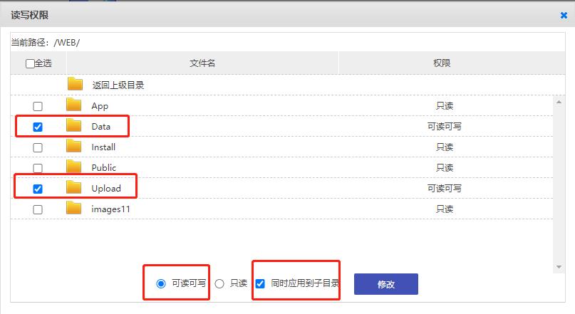 找到【讀寫(xiě)權(quán)限】并打開(kāi),將網(wǎng)站根目錄設(shè)置為只讀,然后將Data和Upload目錄設(shè)置為可讀寫(xiě)