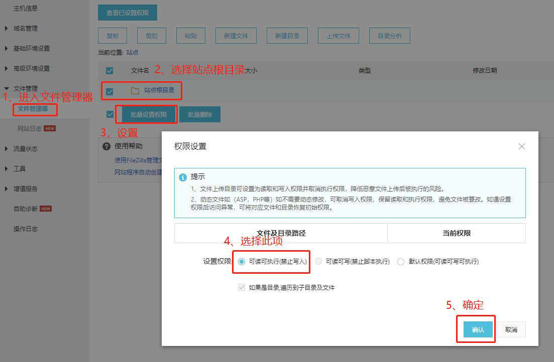 注意:不知道大家有沒有注意到,阿里云虛擬主機權(quán)限設置固定為3種,存在這樣一種限制:設置目錄為禁止寫入,就無法禁止腳本執(zhí)行;禁止腳本執(zhí)行,就必須是可讀可寫。導致存在嚴重的安全隱患(沒有辦法禁止App、Install、Public腳本執(zhí)行權(quán)限)。