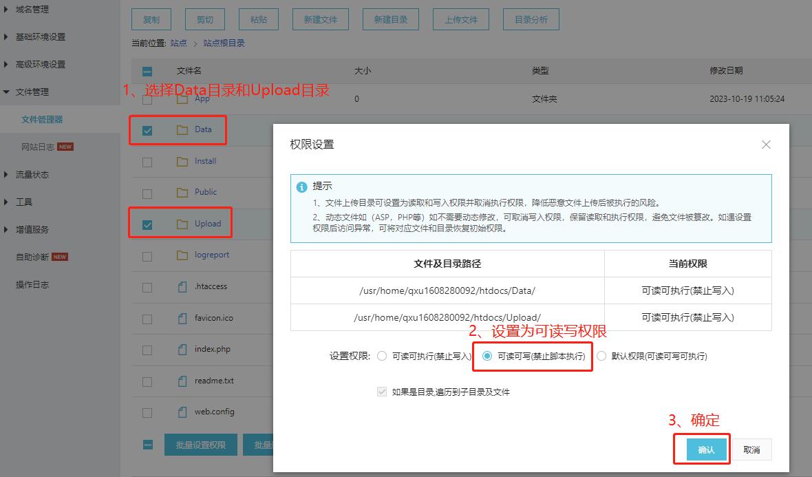 第2步:設置Data目錄和Upload目錄為可讀寫權(quán)限
