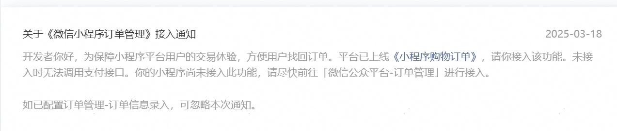 并在在小程序后臺收到了消息:《微信小程序訂單管理》接入通知。如下圖所示