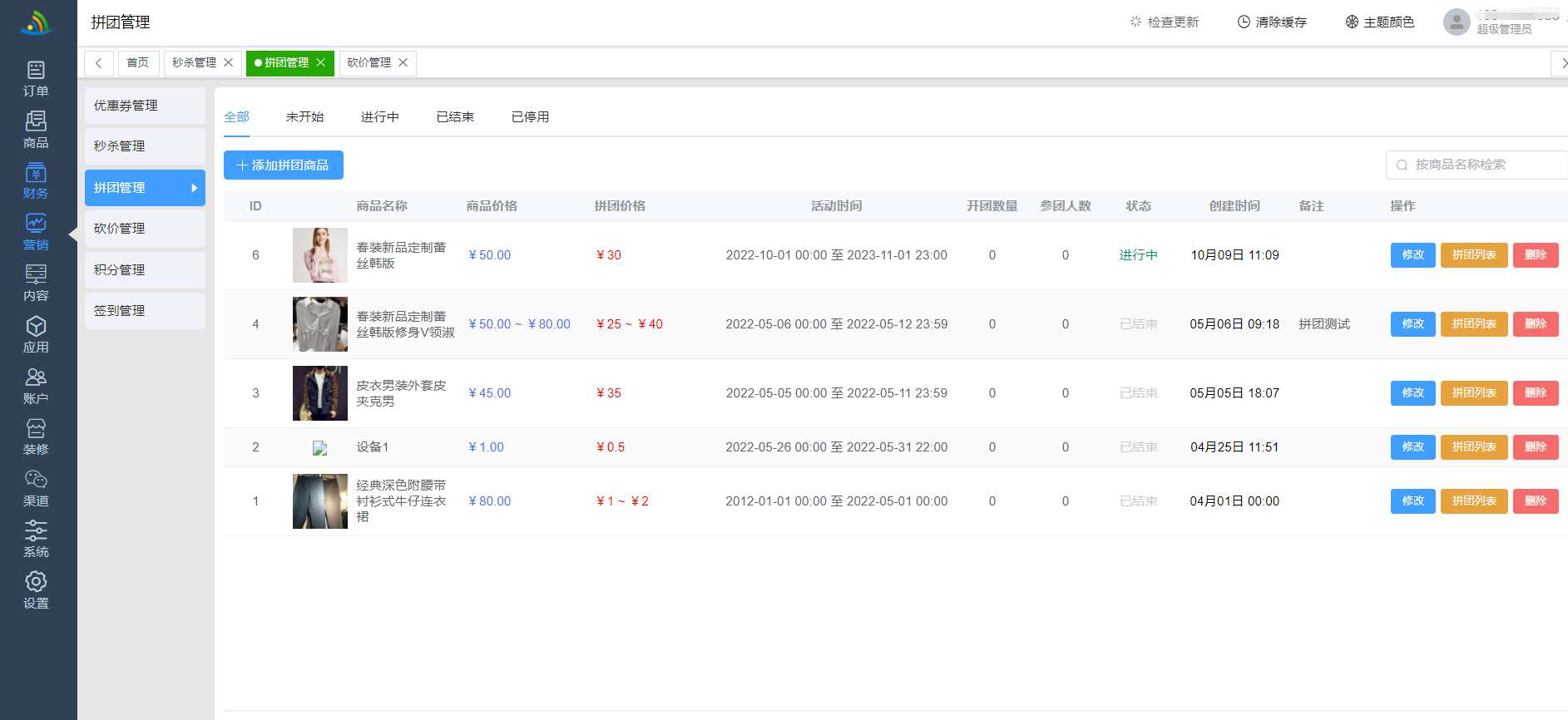 拼團:基于微信社交的拼團,開團后邀請好友成團。