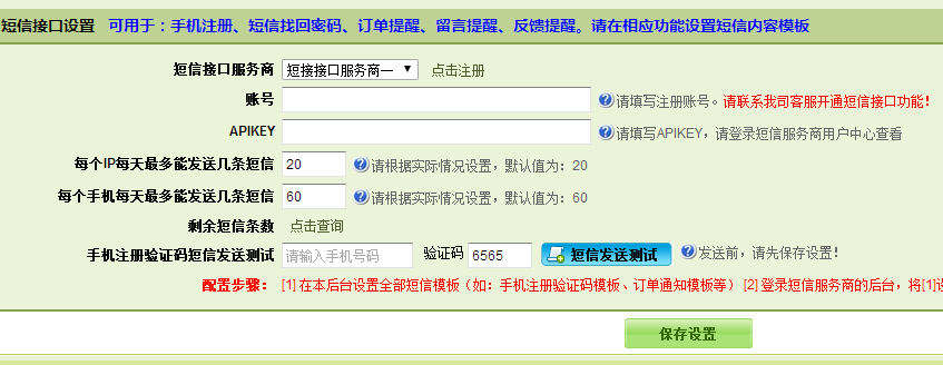 在后臺設(shè)置好短信接口,即可以擁有手機短信注冊、訂單短信通知、留言短信通知、手機短信找回密碼、反饋短信通知等