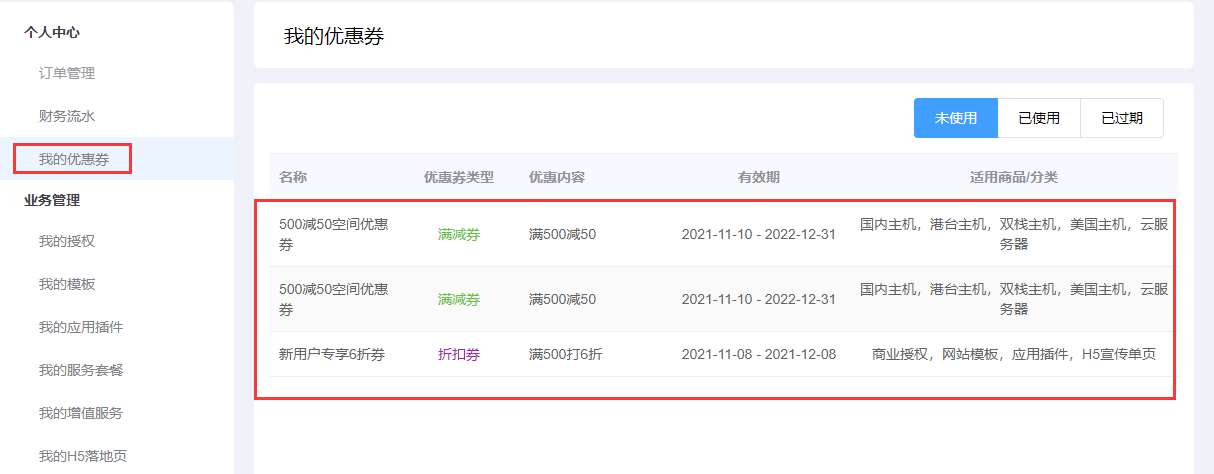 3、查看優惠券:個人中心——》我的優惠券里可以查看已擁有的優惠券。