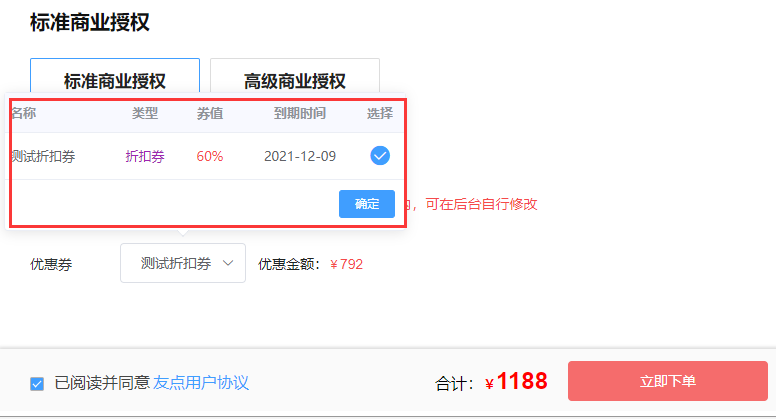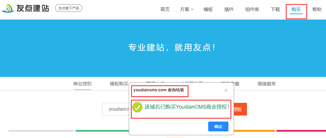 授權購買成功后,可在友點官網——》購買——》商業授權里,查詢是否授權成功。