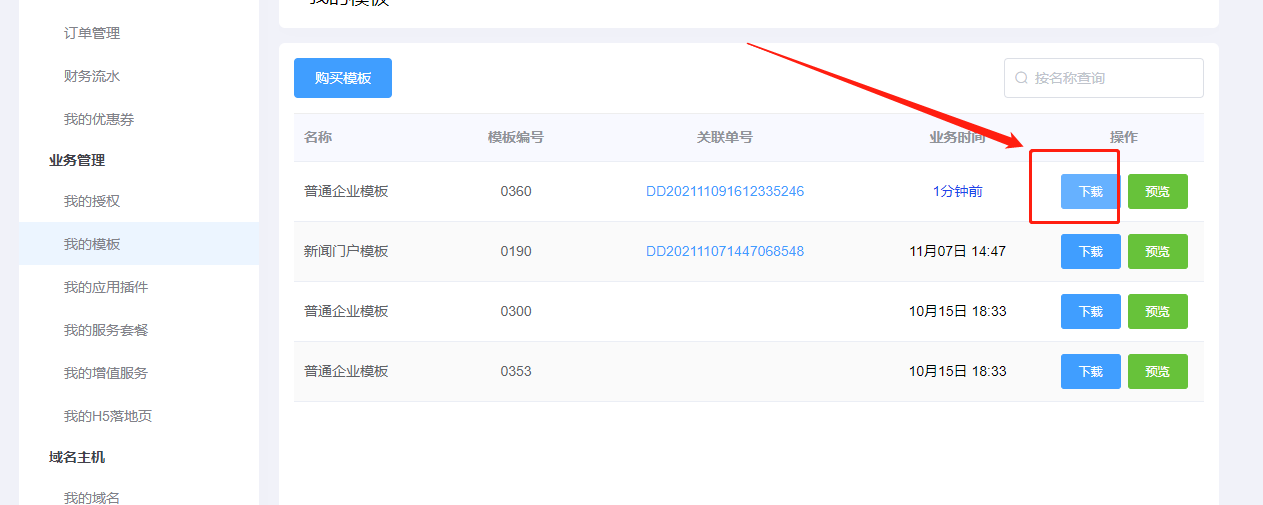 在線購買的模板,可以自行下載網站模板,位置:用戶中心——》我的模板——》下載。